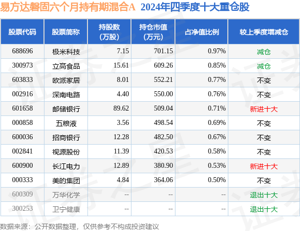 易方达磐固六个月持有期混合A为混合型-偏债基金,根据最新一期基金季报显示,该基金资产配置:股票占净值比10.45%,债券占净值比118.97%,现金占净值比0.91%。基金十大重仓股如下: