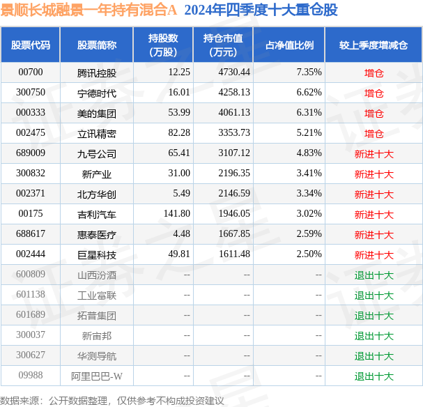 景顺长城融景一年持有混合A为混合型-偏股基金,根据最新一期基金季报显示,该基金资产配置:股票占净值比88.74%,无债券类资产,现金占净值比11.54%。基金十大重仓股如下: