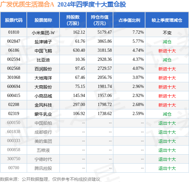 广发优质生活混合A为混合型-偏股基金,根据最新一期基金季报显示,该基金资产配置:股票占净值比85.54%,债券占净值比0.45%,现金占净值比14.35%。基金十大重仓股如下: